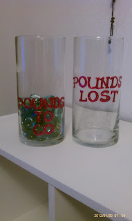 As a side note I finally gave in and got a Pinterest account, you can find my pins here, so many of the things I will be blogging about have come from the great ideas I found on there.This is one of those ideas:I made two jars as you can see. One says Pounds to go and the other says Pounds lost. To be at the ideal weight for me, in my eyes not the eyes of that stupid height weight chart, I would like to lose 61.5 pounds. Each stone in the Pounds to go jar represents half of a pound so there are 123 stones in that jar. Hopefully each week I will be able to move stones over to the Pounds lost and soon enough all the stones will be in that jar!